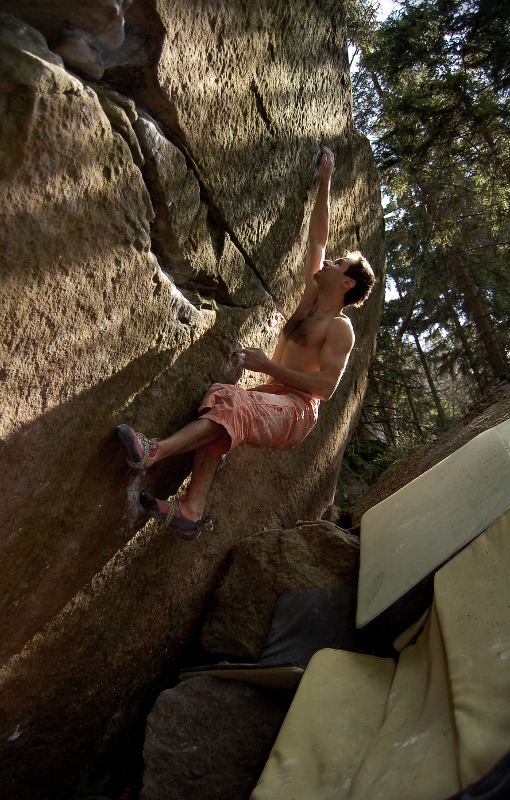 "Highball, można popuscić w gacie, bald jakies 5 m na prawo od Rozmow z katem,charakterystyczna scianko-kantem. Mysle ze bedzie to klasyk rejonu!!! Piekny! Wycena ok 7C, moze mniej,moze wiecej..."