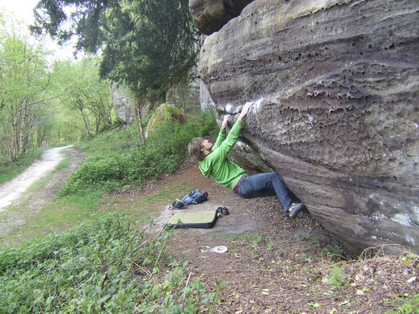 Boy Racer 8A. Znajdujacy sie w gornym sektorze 7 ruchowy bald oferuje silowe i palczaste wspinanie w dosc duzym wydupieniu. Po osuszeniu problemu ( poszla prawie cala rolka srajtasmy) lokalsi pokazali mi sekwencje. Problem zajal mi tylko okolo 5 prob ( pol godziny) ale bez walki sie nie odbylo. Bald jest bardzo ladny i chyba zasluguje na to 8a ale chuj tam wie... Kolejna osemka do kajeta. Szkoda tylko ze mialem trenowac wytrzymke :)"