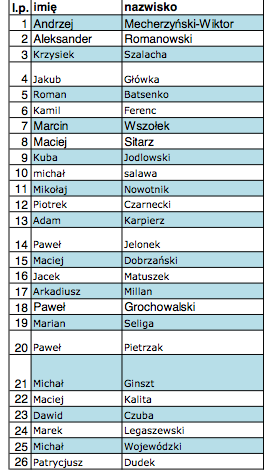 Niestety nie dysponujemy pełnymi wynikami eliminacji, ale biorąc pod uwagę wybitne matematyczne zdolności sędziów i aptekarską precyzję przy zliczaniu wyników nie ma się co dziwić;-). Na szczęście (prawdopodobnie żeby nie psuć zabawy sędziom) zawodnicy na odwołania mieli 5 minut od wywieszenie wyników;-).