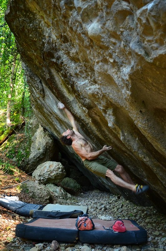 Problem startuje z charakterystycznej "wężokształtnej" struktury (stąd zresztą wzieła się nazwa). Następnie siłowe ruchy po dziurach doprowadzają do trikowego trawersu. Linia kończy się niezależnym boulderm Mosaik 8A. Fredek sieknął Le Boa już w marcu, ale nie za bardzo czuł potrzebę pochwalenia się tym przejściem:-)