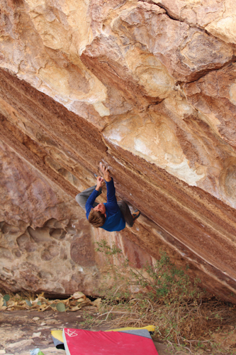 Jorg jak się kolejny raz okazuje, dysponuje nie tylko żelazną psychą, ale i niezłym przytrzymaniem. Na pierwszy ogień poszła skośna rysa Slashface, kiedyś ceniona na 8B+. Teraz co prawda cyferka spadła do V13, czyli mizernego 8B jednak bulder nadal pozostaje jednym z największych klasyków rejonu. Kolejnym testem był Nagual również ceniony wcześniej na V14 i również przeceniony na 8B. Tutaj Jorg wykazał się prawdziwą mocą niemalże rozprawiając się z linią w pierwszej wstawce: