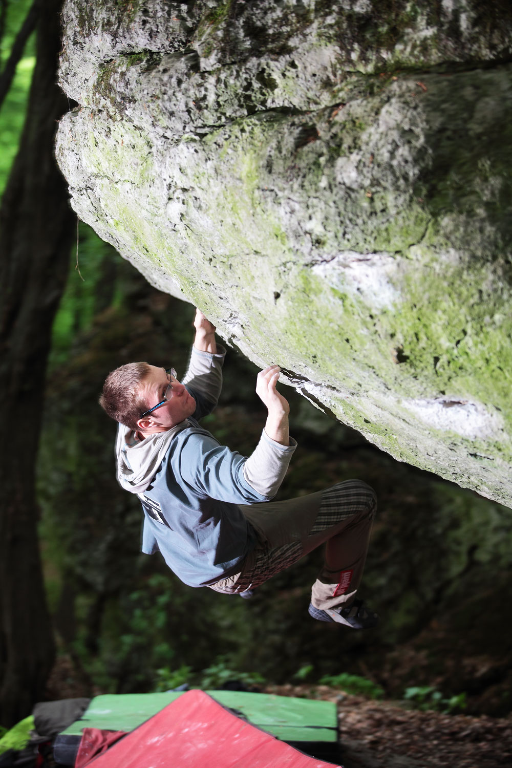 W Konfrontacje pierwszy raz wstawiłem się jakiś rok temu przy okazji wizyty w Zimnym chłopaków z Lublina. Po całym dniu wspinania na różnych boulderach wykonaliśmy kilka wstawek w ten klamiasty trawers. Od tego czasu nie było okazji odwiedzić tej strony Zimnego Dołu. Okazja natrafiła się tydzień temu gdy po dniu spędzonych na krawądkowych projektach postanowiliśmy się „powspinać”. Ponieważ jest to trawers znajdujący się po mniej popularnej stronie dolinki, nie spodziewałem się powrotu w te okolice. Niespodziewanie jednak porachunki z boulderem postanowił wyrównać Rambo [Paweł Jelonek], więc chcąc dotrzymać mu towarzystwa odpuściłem wstawki na Magice:-) Konfrontacje nie były jakimś szczególnym celem, można w sumie powiedzieć że padły dość przypadkowo. Boulder można podzielić na trzy części: krawądkową Salamandrę SSD (7B+), trawers po klamkach który najłatwiej chyba zrobić na rękach (ok 7A+) i Fallena (7A). Całość daję ok 23 ruchów, z czego po ok osiemnastu siłowych ruchach wchodzi się w cruxa po oblaczkach. Boulder ciężko nazwać klasykiem Zimnego Dołu, warto jednak czasem dać odpocząć zmęczonym palcom:-) Na uwagę zasługuje także zróżnicowany charakter wspinania oraz możliwość wypuszczenia nóg na większości ruchów:-)