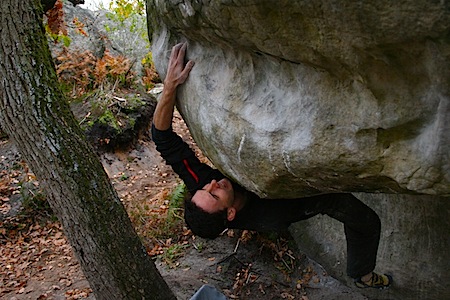 "Siedzielismy tam z Ziółkiem ok. 2 tygodni, w połowie zrobił się niezły "warun". Błękitne niebo, rano szron, później ok. 7-10 stopni - oblaki trzymały jak trzeba. Kuba zrobił przede wszystkim Kheopsa 8B. Prawdopodownie jest to pierwsze polskie 8B w Bleau. Prawdopodobnie bo dzałają tam poznaniacy którzy się nie chwalą ;-) Kheops to klasyk rejonu, kilka przechwytów, obły kant. Kuba potrzebował na niego dwóch dni, pierwszego znalazł patenty, porobił ruchy, a drugiego zasiekał. Udało mu się też pocisnąć Karmę 8A+ i Big Dragona 8A/A+. Oba baldy sa ładne i wymagające. Wyceny różnie ludzie podają - od mocnych 8A, po 8A+. No i na początku pobytu zrobił Eclipsa - 7C w Cul de Chien, niby tylko 7C, ale zrobił to flashem!