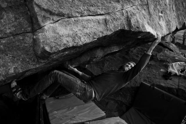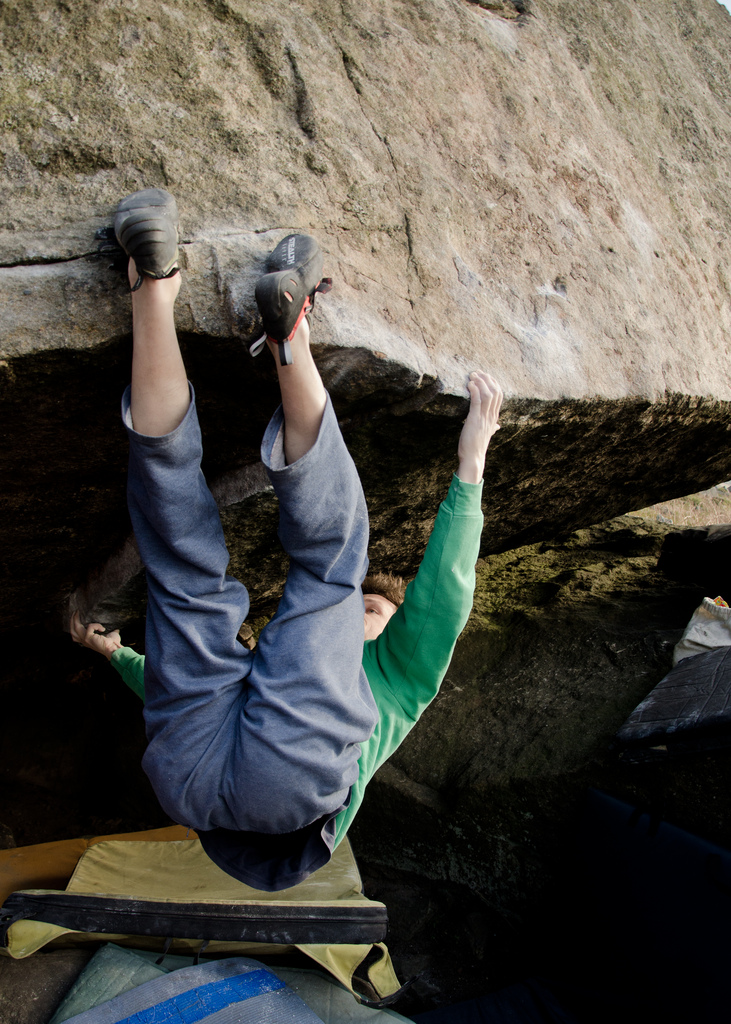 "[...] wkurwia mnie już niemilosiernie. Za każdym razem dotykam crasha. Boulder jest na tyle niski że podczas swingu muszę podciagnać nogi pod brodę. W końcu decyduję się zrezygnować z crasha i polożyć na głazie pod baldem karimatę.Patent się sprawdza i udaje mi się wciągnać ten świetny ale nieco frustrujacy bald'
