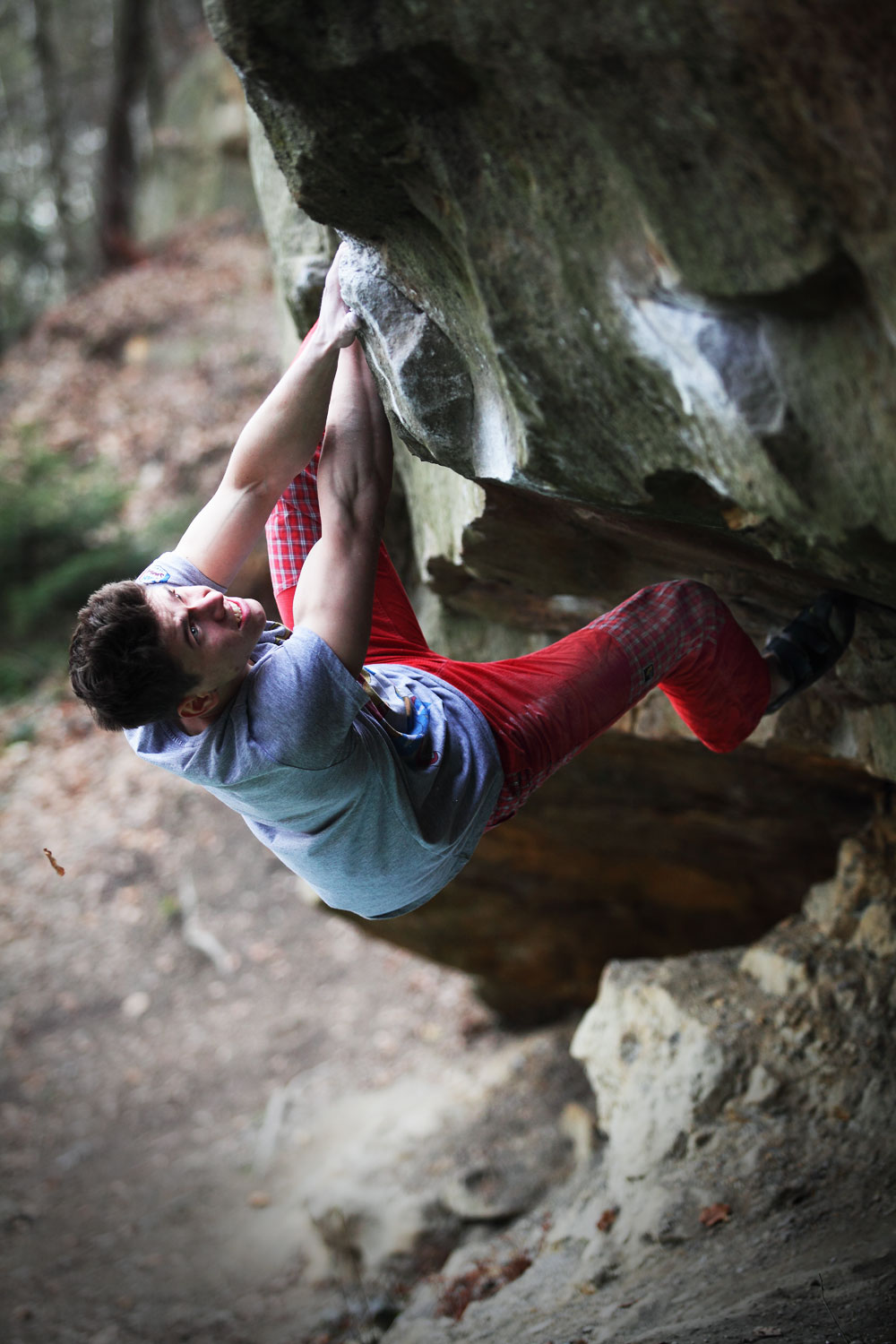 Po chwili prób z Kaliciakiem, znaleźliśmy patenty i można było próbować. Start z klamy startowej z Komórki, w lewo do odciągu i daleki ruch prawą ręką do ostrej krawądy w plecy – (chwyt ten łapie się lewą ręką, robiąc Komórkę Exprokariotyczną), później lewą ręką w lewo do ostrej jak maczeta, ciasnej krawądki, i bania prawą ręką po krzyżu do turbo klamy. Wyjście Amoresem. Tak naprawdę to rozchodzi się o 3 trudne ruchy po małych chwytach na starcie, w później to już się jakoś idzie. Nie wiem,czy ktoś już to zrobił, czy chociaż próbował [próbował, próbował ale nie zrobił:-) - przyp. red], ale jest dość logiczne i ładne, więc postanowiłem się wstawić. Nie mam zbyt dużego doświadczenia jako boulderowiec. Nie jestem pewny co do wyceny, ale na pewno trudniejsze niż Estrella. Nowość nazwałem Masensu! i oceniłem jako 8A. Kolejni pogromcy (mam nadzieję, że za niedługo), wypowiedzą się co do wyceny i jakości balda. Mi się podobał i serdecznie polecam.