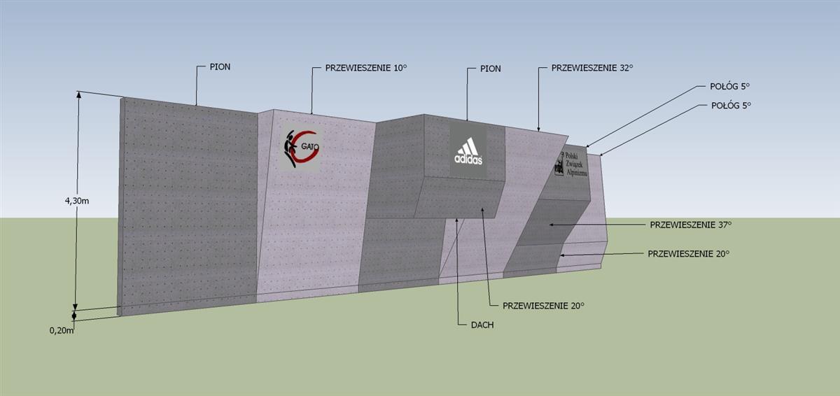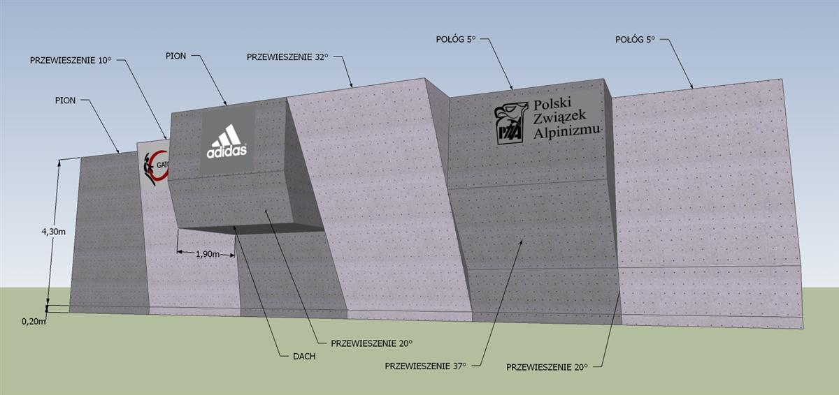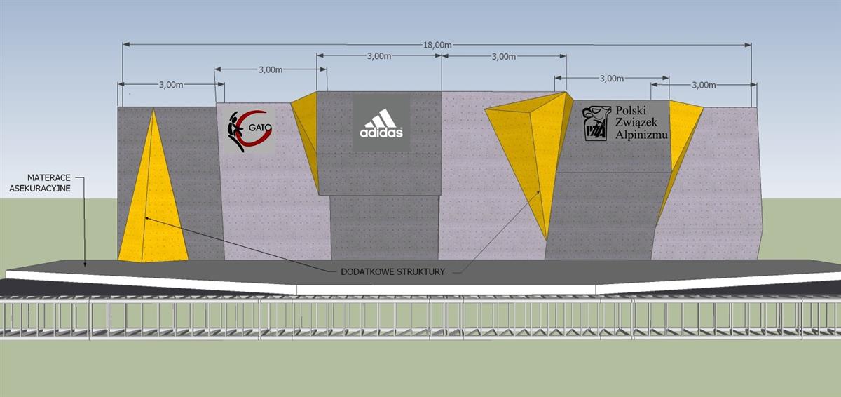 Konstrukcja jest modułowa i możliwa do szybkiej rekonfiguracji w najbardziej newralgicznych strefach – granicach między poszczególnymi blokami. Zacięcia można szybko zabudować lub odsłonić, podłoga ma ogromną trójkątną strukturę. Materac został dedykowany dla tej konkretnie ściany, jest wykonany jako jednolita powierzchnia przez najlepszą firmę w Polsce. Zachowane są strefy bezpieczeństwa zarówno przez wymiar sceny, jak i materaca. Cała konstrukcja jest całkowicie zadaszona. Panele ściany są wykonywane w technologii CNC (komputerowy wykrój paneli) , ich ustawienie na specjalnej scenie dodaje lepszej widoczności dla widzów.