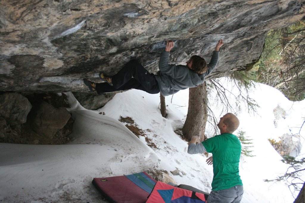 Daniel poświęcił cztery dni na rozpracowanie projektu jeszcze w zeszłym roku ale wtedy okazało się że kilka ruchów (w tym wspomnianie trudne przestawienia nóg) jest póki co nieurabialnych. W tym roku udało się skompletować brakujące przechwyty i projekcik padł drugiego dnia prób pomimo iście arktycznych warunków, silnego wiatru i zalodzonego topoutu. Tym samym Paint it Black V15 (czyli po ludzku mówięc 8C) czeka na powtórzenia.