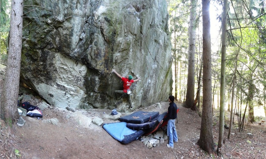 8A+ dodając, że "zna łatwiejsze buldery w tym stopniu":-). Przyznajmy że oprócz trudności wrażenie robi też wysokość. Co prawda crux jest raczej niewysoko, ale w górnej partii też należy zachować czujność, gdyż skutki ewentualnej gleby mogły by być niewesołe. Przypomnijmy że Filip jest również autorem nieco trudniejszej linii w Dolinie: