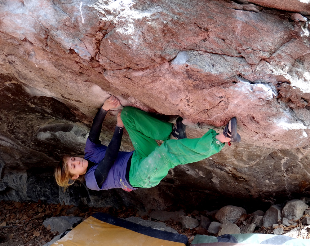"Podczas pierwszego tegorocznego wyjazdu zagranicznego udało mi się przejść znany klasyk szwajcarskiego Chironico Souvenir 8A. Rozpracowanie bulderu zajęło mi 3 dni. Souvenir to krótki i bardzo siłowy bulder. Podczas przejścia korzystałam z dobrej dwójki którą łapałam kciukiem. Wiem że niektórzy mają wątpliwości czy z tego chwytu można korzystać, pomimo tego że leży idealnie w lini balda. Jednak robiąc Souvenira wspinali się ze mną inni wspinacze z dużo większym ósemkowym doświadczeniem i korzystali z dwójki więc uznałam że tak to właśnie trzeba robić. Bulder oceniam na łatwy jak na osiem A. Ale siłowe, mocno przewieszone buldery zdecydowanie są moją mocną stroną."